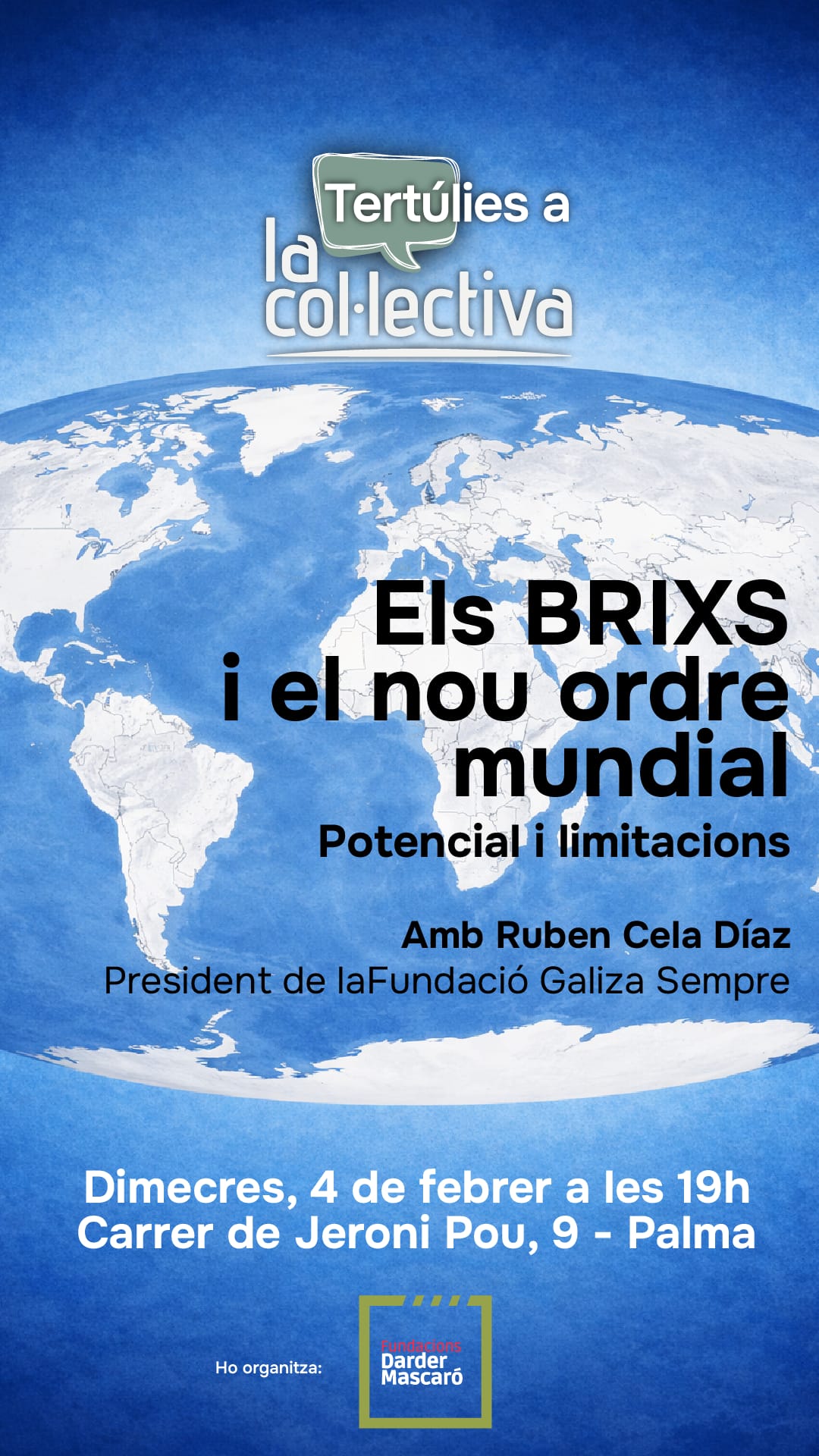 El pròxim dimecres 4 de febrer ens retrobarem a La Col·lectiva, a les 19h, per la segona Tertúlia, aquesta sobre el BRIXS i el nou Ordre Mundial.